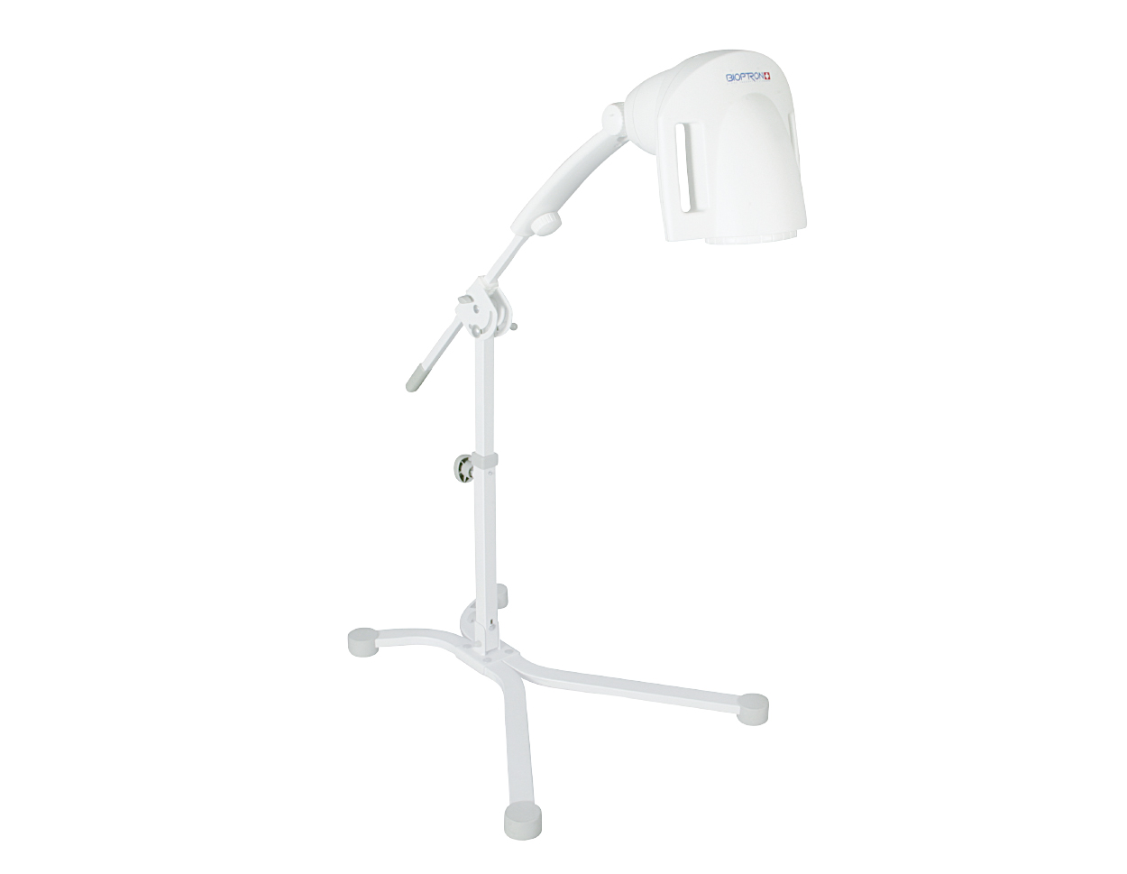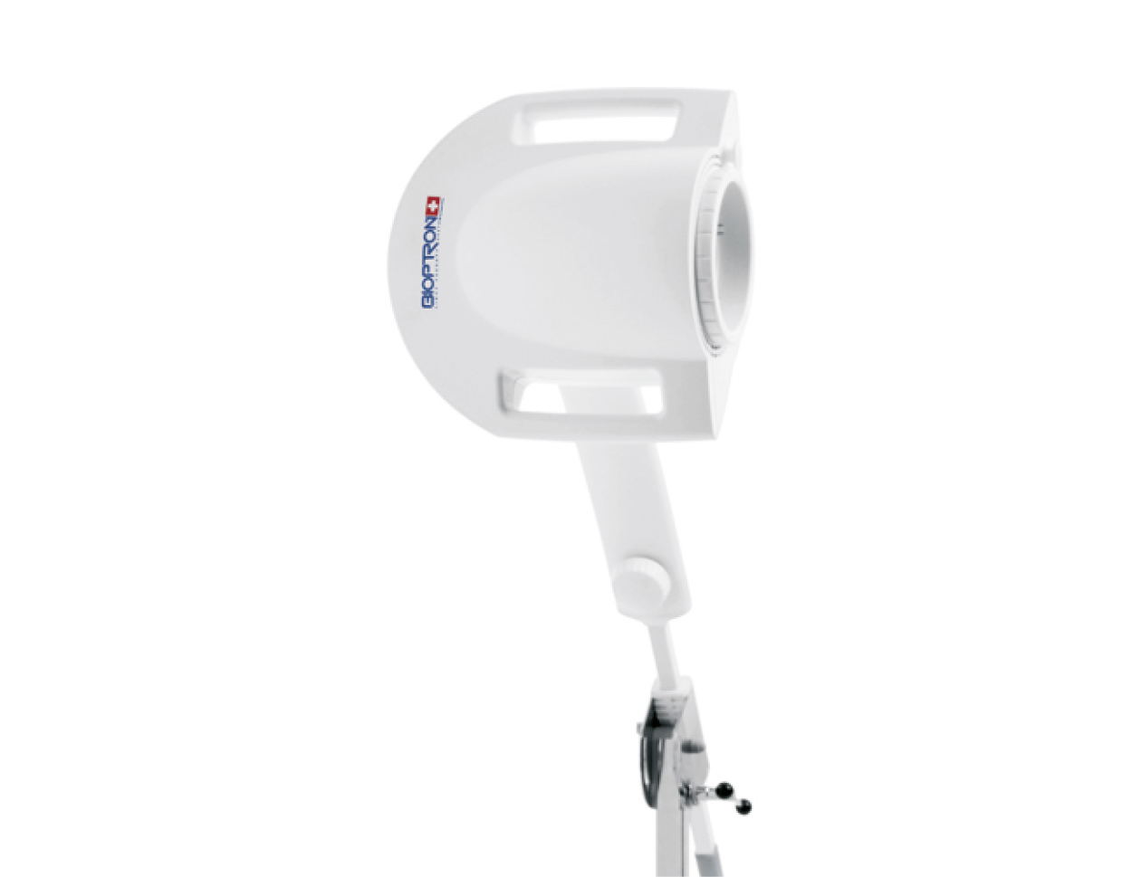 The device is available with an ergonomic table stand that can be combined with a functional floor stand, allowing flexible use in domestic and professional environments. Easily adjustable height and head inclination as well as the ability to rotate the device head up to 360° allow a convenient usage in nearly any position. Treatments can easily be timed by a control panel down to 30 seconds. An integrated distance rod ensures the recommended distance from the skin surface. The table stand is additionally equipped with a dust cover and a comfortable supportive mat (disinfectable, exchangeable and washable).